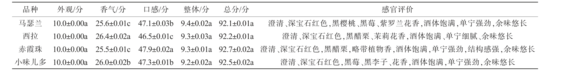 表5 不同葡萄品种干红葡萄酒的感官评分