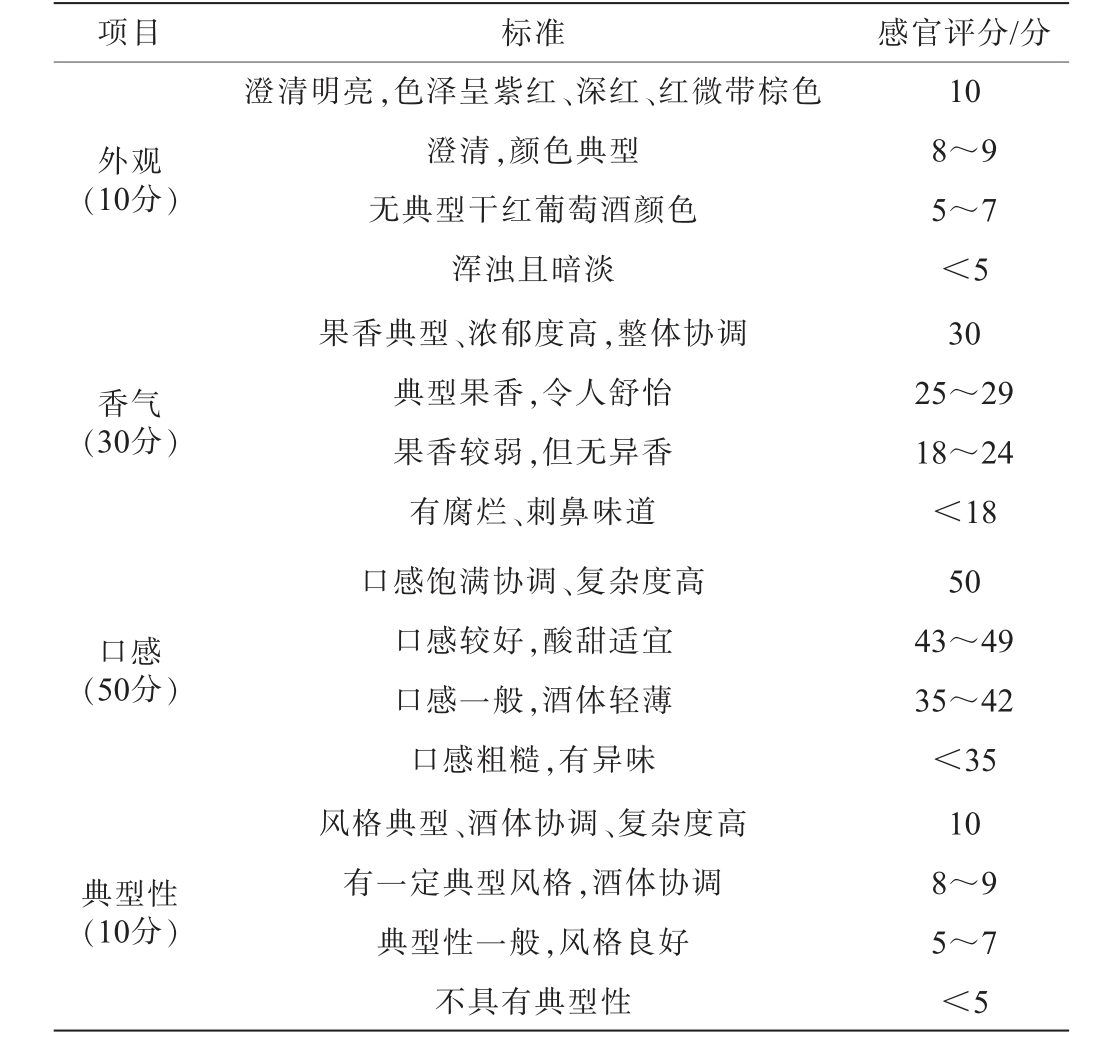 组织8位经过感官培训的葡萄酒专业品鉴人员从外观、香气、口感、典型性4个方面对干红葡萄酒进行感官评价,满分100分,以《葡萄酒中国鉴评体系》为评分标准[21],干红葡萄酒感官评价标准见表1。