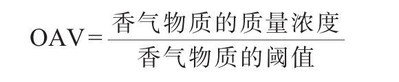 气味活性值(OAV)可评价葡萄酒挥发性风味物质对对葡萄酒整体香气贡献程度,OAV越大说明该物质对总体香气的贡献越明显,其计算公式如下[20]: