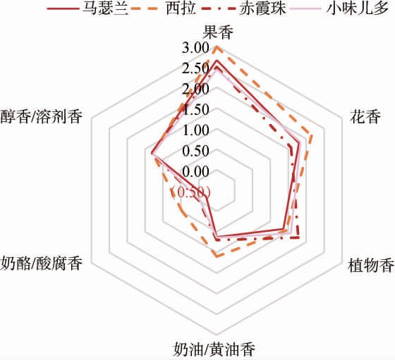 图1 不同葡萄品种干红葡萄酒样品的香气轮廓图