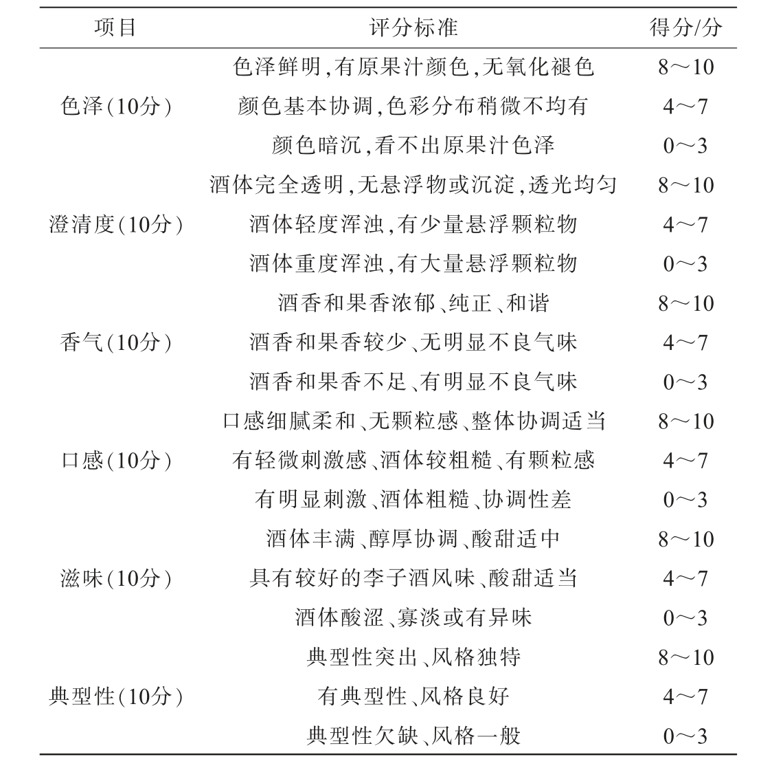 采用定量描述分析法对葡萄酒样品的感官特性进行评价,评审小组由15名经过感官培训的专业人员组成,从色泽、澄清度、香气、口感、滋味及典型性6个方面对李子果酒进行感官评价,每项指标满分10分,李子果酒感官评价标准见表1。