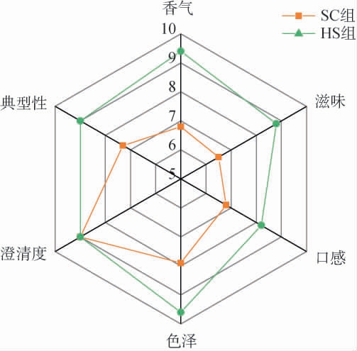 李子果酒感官评分雷达图见图2。由图2可知,HS组样品典型性、香气、滋味、口感和色泽评分(分别为9.0分、9.4分、8.8分、8.2分和9.6分)均优于SC组样品(分别为7.3分、6.8分、6.5分、6.8分和7.9分),而两组样品澄清度得分一致,均为9.0分,HS组、SC组样品感官评分分别为54分、44.3分。因此,采用红曲、酵母混合发酵李子果酒感官品质更佳,其原因可能是,混菌发酵丰富微生物菌群,导致代谢产物种类增加,此外,微生物之间的相互作用还可影响代谢途径和代谢产物发生变化,影响果酒中呈色、呈味物质[38]。