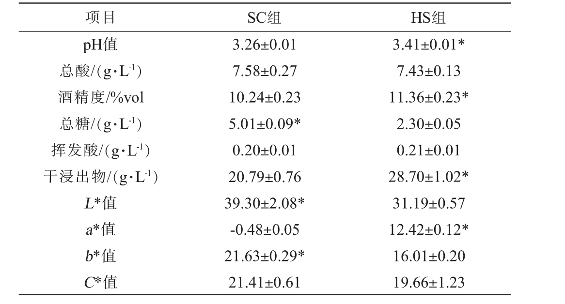 项目 SC组 HS组pH值总酸/(g·L-1)酒精度/%vol总糖/(g·L-1)挥发酸/(g·L-1)干浸出物/(g·L-1)L*值a*值b*值C*值3.26±0.01 7.58±0.27 10.24±0.23 5.01±0.09*0.20±0.01 20.79±0.76 39.30±2.08*-0.48±0.05 21.63±0.29*21.41±0.61 3.41±0.01*7.43±0.13 11.36±0.23*2.30±0.05 0.21±0.01 28.70±1.02*31.19±0.57 12.42±0.12*16.01±0.20 19.66±1.23