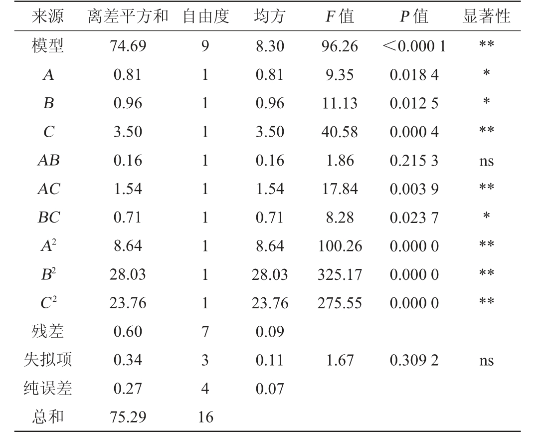 来源 离差平方和 自由度 均方 F 值 P 值 显著性模型**ABCA B****AC BC A2 B2 C2 96.26 9.35 11.13 40.58 1.86 17.84 8.28 100.26 325.17 275.55<0.000 1 0.018 4 0.012 5 0.000 4 0.215 3 0.003 9 0.023 7 0.000 0 0.000 0 0.000 0 ns*********残差失拟项纯误差总和74.69 0.81 0.96 3.50 0.16 1.54 0.71 8.64 28.03 23.76 0.60 0.34 0.27 75.29 91111111117341 6 8.30 0.81 0.96 3.50 0.16 1.54 0.71 8.64 28.03 23.76 0.09 0.11 0.07 1.67 0.309 2 ns