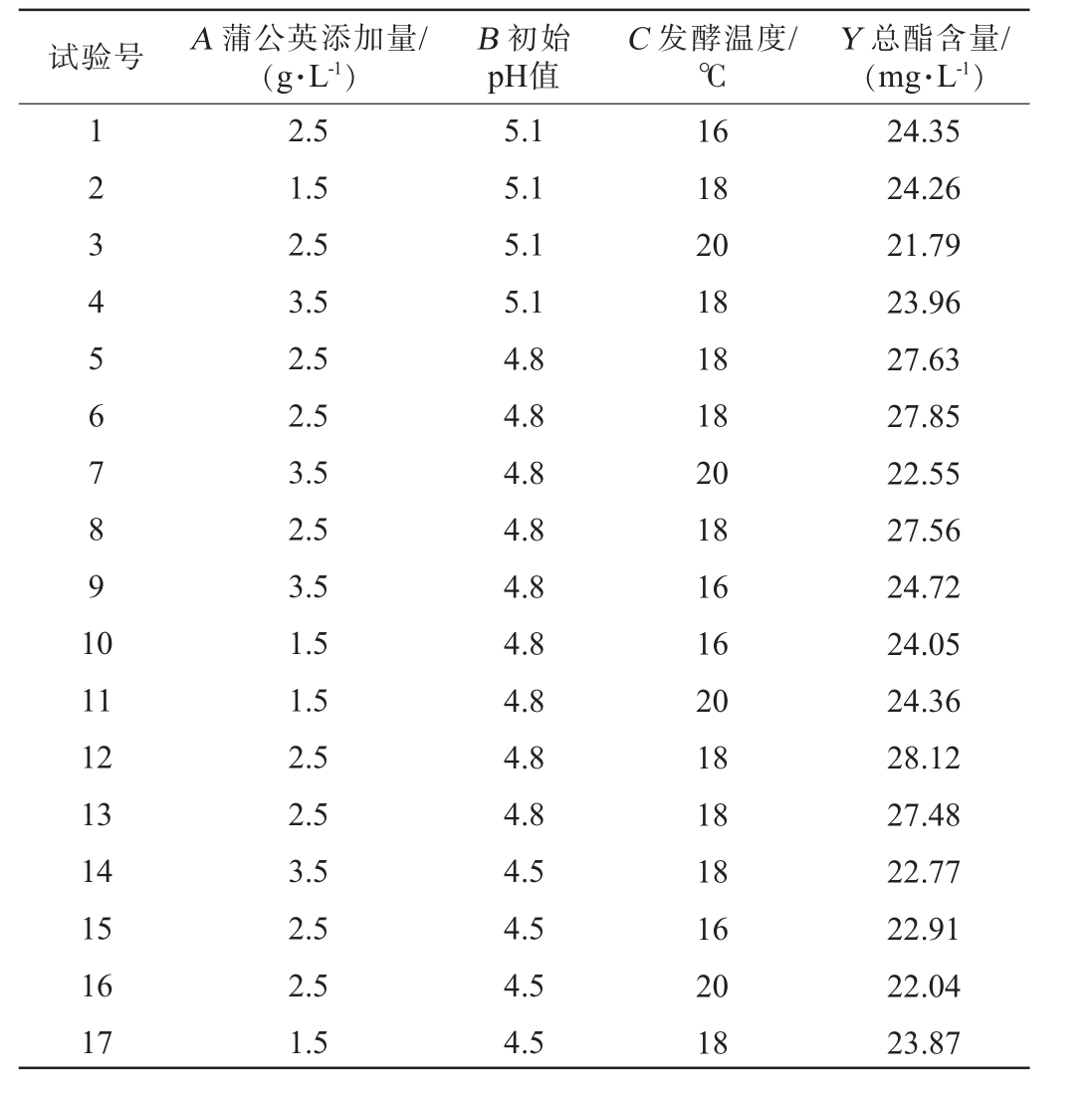 试验号 A 蒲公英添加量/(g·L-1)B 初始pH值C 发酵温度/℃ Y 总酯含量/(mg·L-1)1 234567891 0 11 12 13 14 15 16 17 2.5 1.5 2.5 3.5 2.5 2.5 3.5 2.5 3.5 1.5 1.5 2.5 2.5 3.5 2.5 2.5 1.5 5.1 5.1 5.1 5.1 4.8 4.8 4.8 4.8 4.8 4.8 4.8 4.8 4.8 4.5 4.5 4.5 4.5 16 18 20 18 18 18 20 18 16 16 20 18 18 18 16 20 18 24.35 24.26 21.79 23.96 27.63 27.85 22.55 27.56 24.72 24.05 24.36 28.12 27.48 22.77 22.91 22.04 23.87