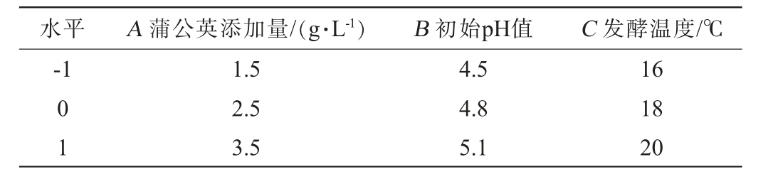 水平 A 蒲公英添加量/(g·L-1) B 初始pH值 C 发酵温度/℃-1 01 1.5 2.5 3.5 4.5 4.8 5.1 16 18 20