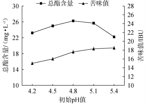 图2 初始pH值对蒲公英精酿啤酒总酯含量及苦味值的影响