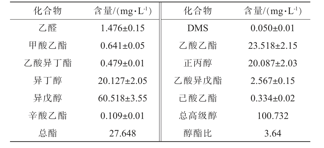 化合物 含量/(mg·L-1) 化合物 含量/(mg·L-1)乙醛甲酸乙酯乙酸异丁酯异丁醇异戊醇辛酸乙酯总酯1.476±0.15 0.641±0.05 0.479±0.01 20.127±2.05 60.518±3.55 0.109±0.01 27.648 DMS乙酸乙酯正丙醇乙酸异戊酯己酸乙酯总高级醇醇酯比0.050±0.01 23.518±2.15 20.087±2.03 2.567±0.15 0.334±0.02 100.732 3.64