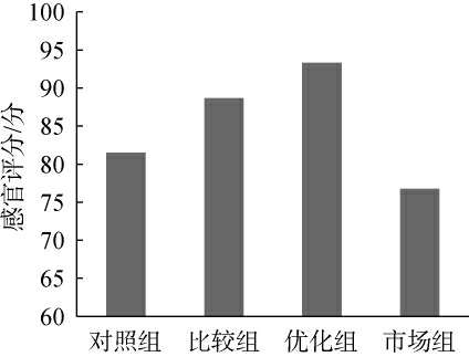 以未添加蒲公英的精酿啤酒为对照组,工艺优化前的蒲公英精酿啤酒为比较组,工艺优化后的蒲公英精酿啤酒为优化组及市场上购买的普通工业啤酒为市场组,对4组啤酒样品进行感官评价,结果见图5。由图5可知,优化组精酿啤酒感官评分最高,为93.33分,酒体醇厚、酯香浓郁协调,有酒花香及蒲公英特有的清香,口感纯正,苦味适当;比较组精酿啤酒的感官评分为88.67分,酯香及苦味协调性稍显不足;对照组精酿啤酒感官评分为81.50分,酯香不明显,口感粗糙,有后苦;市场组啤酒感官评分为76.75分,香气不明显,口感寡淡,微有老化味。