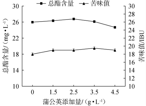 2.1.1 蒲公英添加量对总酯含量及苦味值的影响蒲公英添加量对总酯含量及苦味值的影响见图1。