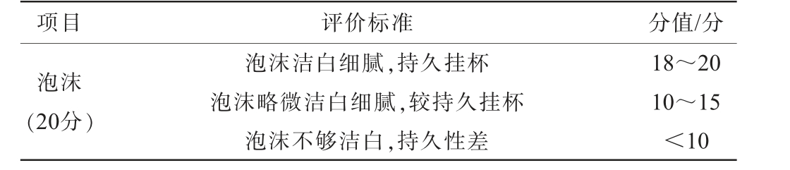 项目 评价标准 分值/分泡沫(20分)泡沫洁白细腻,持久挂杯泡沫略微洁白细腻,较持久挂杯泡沫不够洁白,持久性差18~20 10~15<10