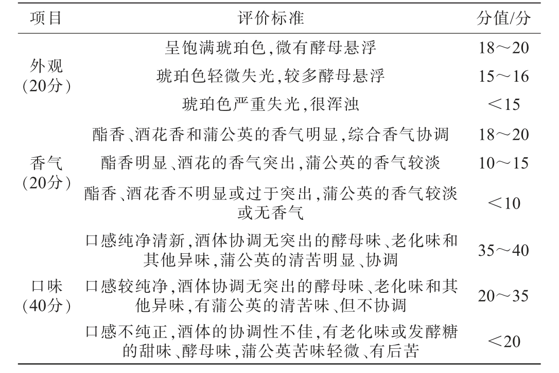 Table 2 Sensory evaluation standards of dandelion craft beer