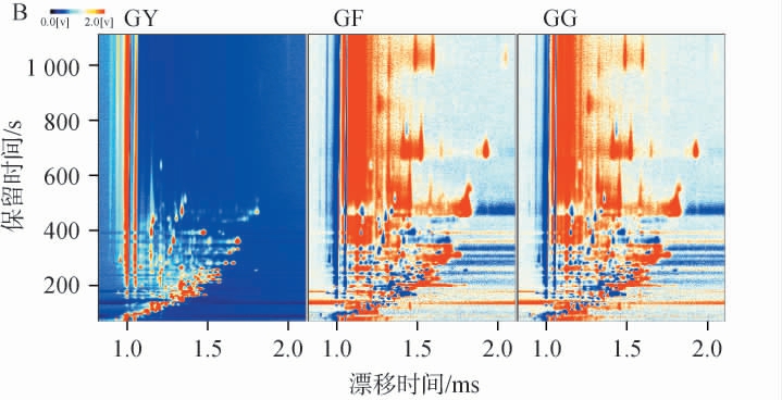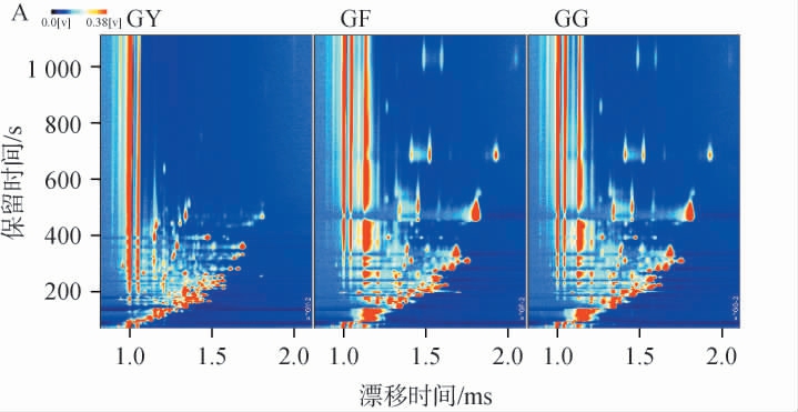 由图6A可知,不同加工阶段的枣酪样品中的挥发性有机物存在差异。以GY为对照组,其他样品的谱图扣减参比,若二者挥发性有机物一致,则扣减后的背景为白色,而红色代表该物质的浓度高于参比,蓝色代表该物质的浓度低于参比。由图6B可知,GF组与GG组明显含有更丰富的挥发性风味物质,迁移时间为1.0~2.0 ms内,各风味物质的保留时间分布在100~1 100 s之间。