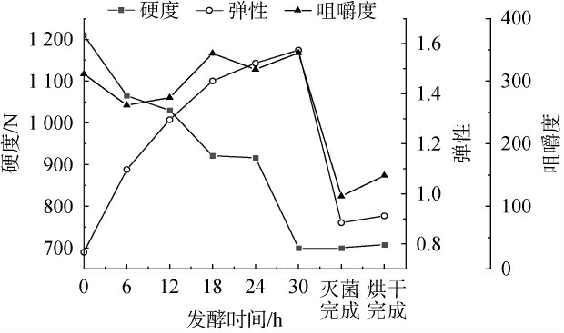 枣酪加工过程中质构的变化见图3。由图3可知,在发酵过程(0~30 h)中,硬度整体呈下降趋势,硬度由1 210.50 N下降至700.53 N;弹性逐渐增加,弹性由0.77增加至1.57;咀嚼度为硬度弹性的综合体现,呈先下降后增加趋势,但变化不显著,由311.44增加至345.11。这是由于在微生物作用下,糖类物质被大量消耗,产生的部分有机酸促进果胶分解,使果肉组织逐渐软化[33];经过灭菌及烘干处理后,高温和失水加速果胶酶活性,使原果胶分解为可溶性果胶,细胞间黏性降低,细胞壁崩解,果肉纤维收缩,导致弹性大幅下降[34],硬度变化不明显,咀嚼度随弹性下降而下降。