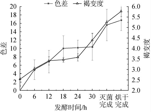 枣酪加工过程中色差值和褐变度的变化见图4。由图4可知,在发酵过程(0~30 h)中,枣酪的色差值和褐变度均整体呈上升趋势,色差值增加至10.39,褐变度分别由2.53增加至4.39,提高了73.31%,这是由于发酵过程中多酚氧化酶催化酚类物质羟基化,生成三羟基化合物,而后又被邻酚氧化为羟基醌,聚合生成黑色素[35],引起褐变。在灭菌、干燥阶段,枣酪的色差值和褐变度均增加,分别增加至16.74、5.24。 其原因可能是,高温处理会催化美拉德反应和焦糖化反应,引起色差和褐变度的升高[36]。