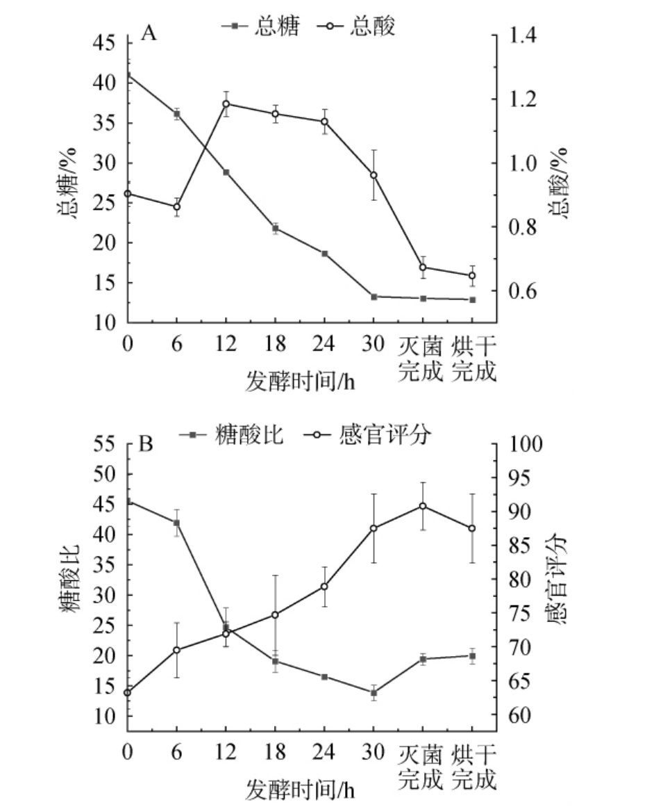 图1 枣酪加工过程中总糖、总酸含量(A)、糖酸比和感官评分(B)的变化