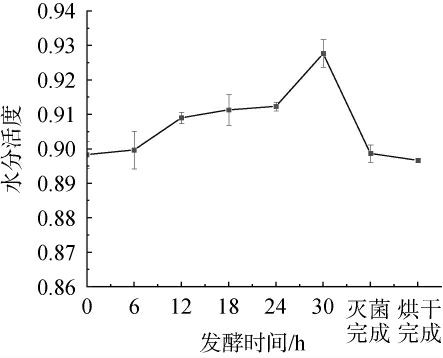 水分活度是指食品中水的蒸汽压与同温度下纯水的饱和蒸气压的比值[37]。枣酪加工过程中水分活度的变化见图5。由图5可知,在发酵过程中,枣酪的水分活度呈上升趋势,由0.898增加至0.927,提高了3.27%,这是由于在微生物作用下,枣内的糖分被大量分解转化成为酒精、二氧化碳、乳酸和水等代谢产物,部分结合水也随着发酵程度加深造成的组织结构破坏转换为自由水[38]。在灭菌、干燥阶段,水分活度随之下降,减少至0.897,相较于未发酵样品,最终制成的枣酪水分活度降低了0.19%。