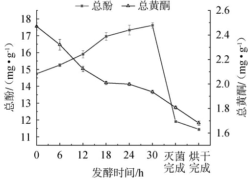 枣酪加工过程中总酚和总黄酮含量的变化见图2。 由图2可知,在加工过程中,总黄酮含量均呈下降趋势,在发酵过程(0~30 h)中,总黄酮含量由2.47 mg/g下降至1.94 mg/g;经过灭菌、烘干,其含量降至1.68 mg/g,下降了32.0%。随着发酵时间在0~30 h范围内的增加,总酚含量从14.74 mg/g逐渐增加至17.62 mg/g,增加了19.48%,其原因可能是由于原料中的酪氨酸和苯丙氨酸等物质经过微生物发酵合成了多酚类化合物,这与陈小伟等[31]的研究结果一致。酚类物质和黄酮类物质在高温下均会受热分解,同时也会氧化分解,导致含量大幅降低[32]。