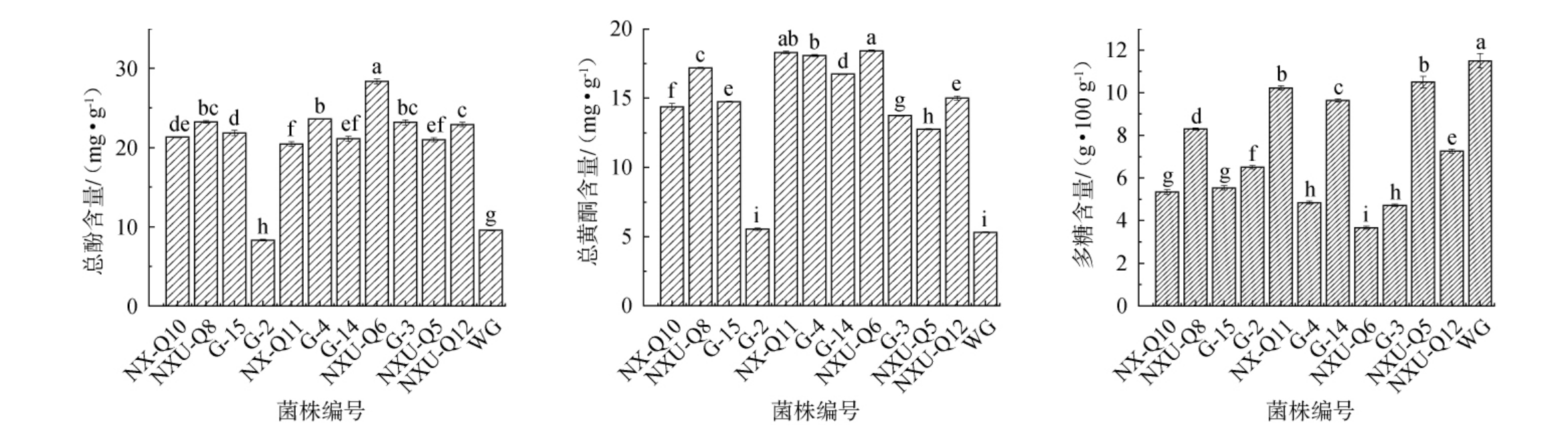 图1 不同菌株发酵后枸杞皮渣中总酚含量、总黄酮含量和多糖含量的变化