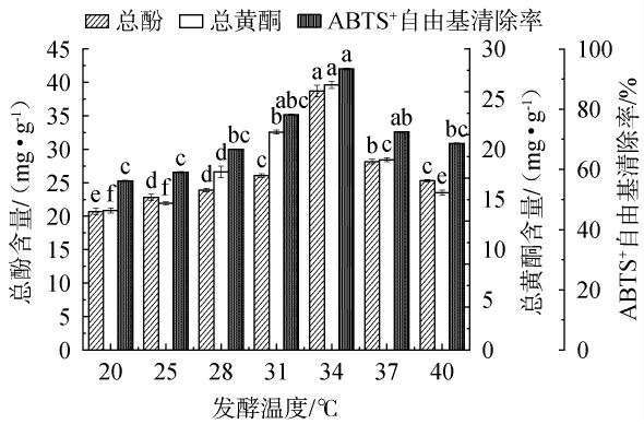 图7 发酵温度对总酚含量、总黄酮含量和ABTS+自由基清除率的影响