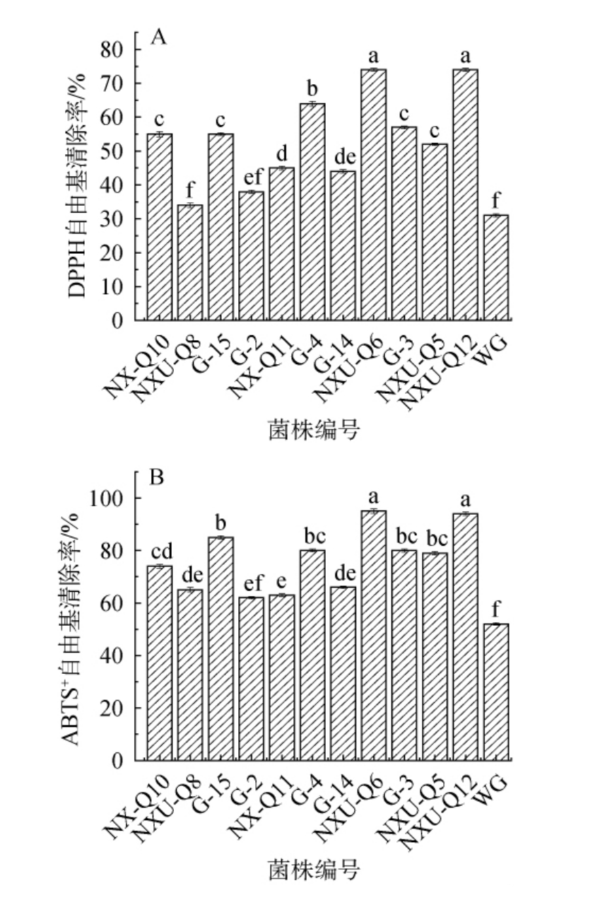 Fig.2 Changes of DPPH radical scavenging activity (A) and ABTS+radical scavenging activity (B) after fermentation of goji pomace by different strains