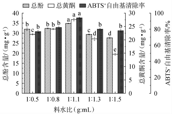 图5 料水比对总酚含量、总黄酮含量和ABTS+自由基清除率的影响