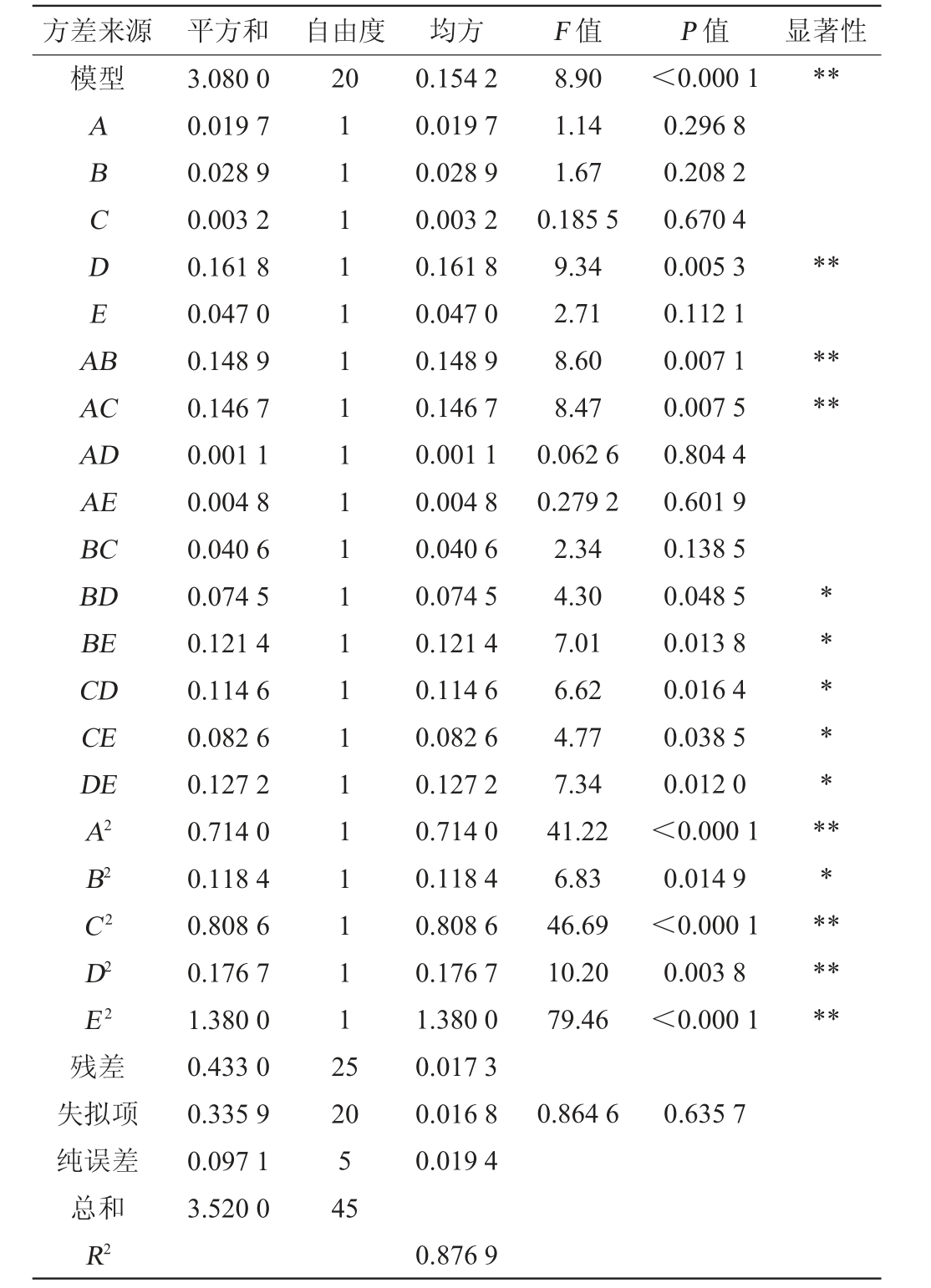 方差来源 平方和 自由度 均方 F 值 P 值 显著性模型**20 ABCDEA B**AC AD AE BC BD BE CD CE DE A2 B2 C2 D2 E2 8.90 1.14 1.67 0.185 5 9.34 2.71 8.60 8.47 0.062 6 0.279 2 2.34 4.30 7.01 6.62 4.77 7.34 41.22 6.83 46.69 10.20 79.46<0.000 1 0.296 8 0.208 2 0.670 4 0.005 3 0.112 1 0.007 1 0.007 5 0.804 4 0.601 9 0.138 5 0.048 5 0.013 8 0.016 4 0.038 5 0.012 0<0.000 1 0.014 9<0.000 1 0.003 8<0.000 1******************残差失拟项纯误差总和R2 3.080 0 0.019 7 0.028 9 0.003 2 0.161 8 0.047 0 0.148 9 0.146 7 0.001 1 0.004 8 0.040 6 0.074 5 0.121 4 0.114 6 0.082 6 0.127 2 0.714 0 0.118 4 0.808 6 0.176 7 1.380 0 0.433 0 0.335 9 0.097 1 3.520 0 111111111111111111112 5 20 5 45 0.154 2 0.019 7 0.028 9 0.003 2 0.161 8 0.047 0 0.148 9 0.146 7 0.001 1 0.004 8 0.040 6 0.074 5 0.121 4 0.114 6 0.082 6 0.127 2 0.714 0 0.118 4 0.808 6 0.176 7 1.380 0 0.017 3 0.016 8 0.019 4 0.864 6 0.635 7 0.876 9