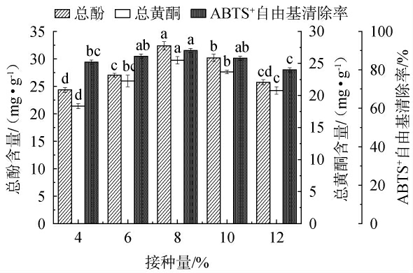 图3 接种量对总酚含量、总黄酮含量和ABTS+自由基清除率的影响