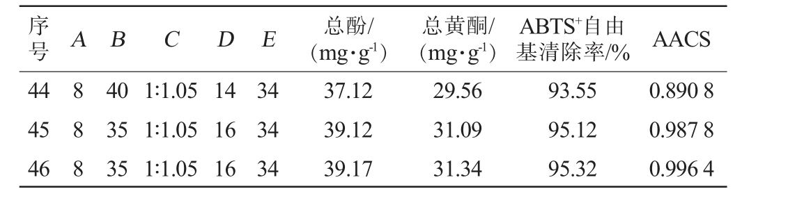 序号 A B C D E 总酚/(mg·g-1)总黄酮/(mg·g-1)ABTS+自由基清除率/% AACS 44 45 46 888 40 35 35 1∶1.05 1∶1.05 1∶1.05 14 16 16 34 34 34 37.12 39.12 39.17 29.56 31.09 31.34 93.55 95.12 95.32 0.890 8 0.987 8 0.996 4