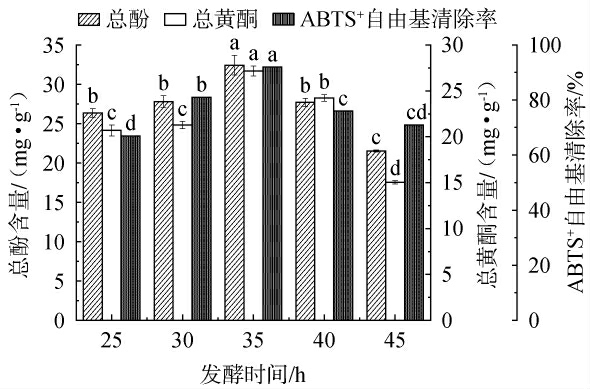 图4 发酵时间对总酚含量、总黄酮含量和ABTS+自由基清除率的影响