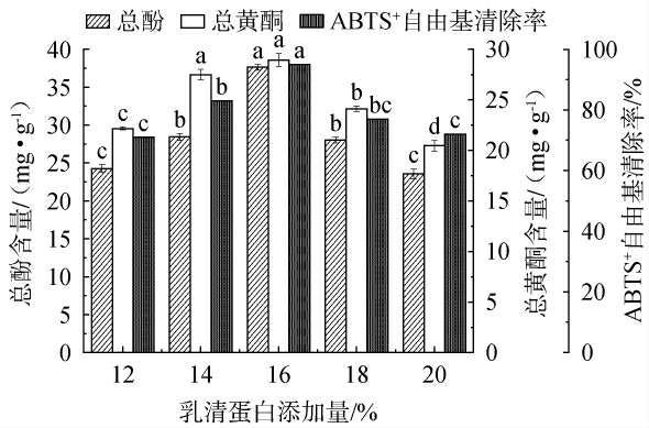 图6 乳清蛋白添加量对总酚含量、总黄酮含量和ABTS+自由基清除率的影响