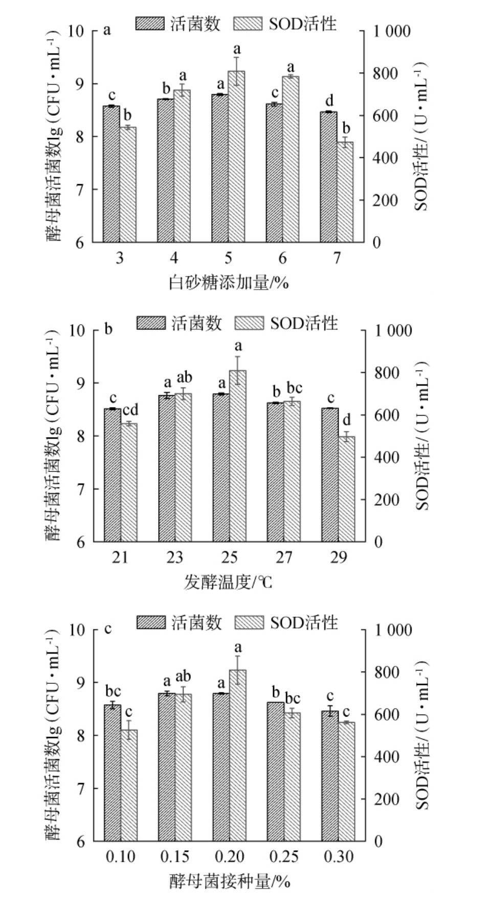 图1 白砂糖添加量(a)、发酵温度(b)、酵母菌接种量(c)对酵母菌活菌数和超氧化物歧化酶活性的影响