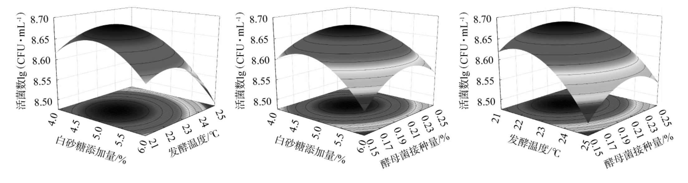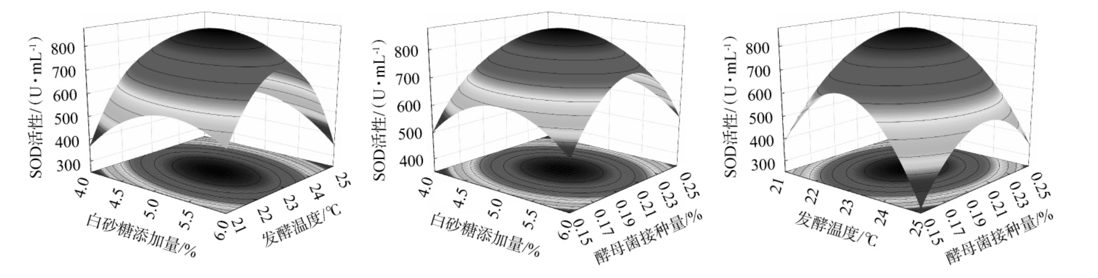 由图2可知,白砂糖添加量和发酵温度、白砂糖添加量和酵母菌接种量、发酵温度和酵母菌接种量交互作用对酵母菌活菌数影响较大;白砂糖添加量和发酵温度、发酵温度和酵母菌接种量交互作用对SOD活性影响较大。这与表4方差结果一致。