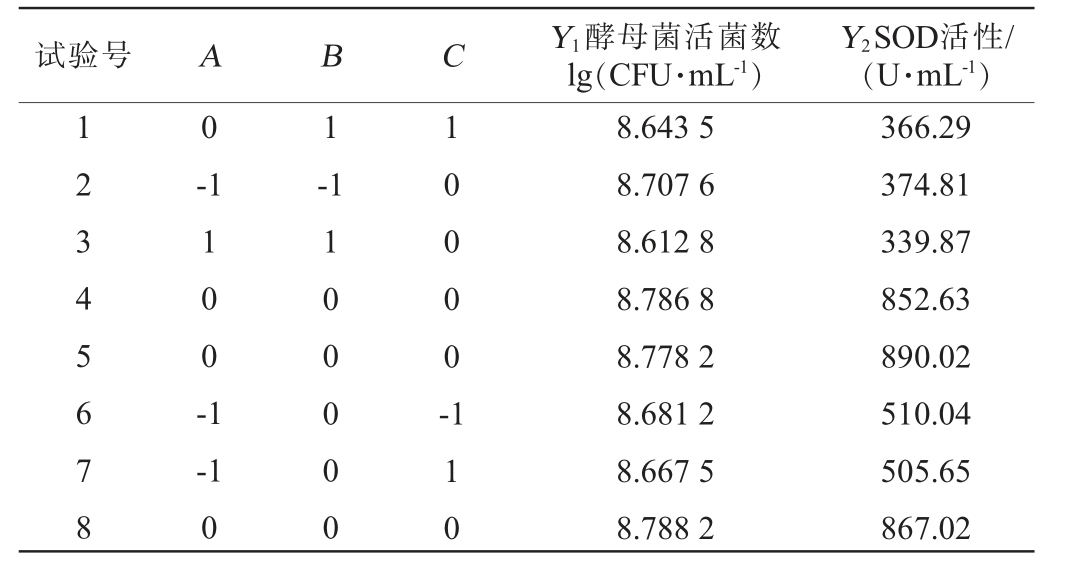 试验号 A B C Y1酵母菌活菌数lg(CFU·mL-1)Y2SOD活性/(U·mL-1)12345678 0 1-11 0 0 -1-1 1 0 0 0 0 --1 0 100000 110 8.643 5 8.707 6 8.612 8 8.786 8 8.778 2 8.681 2 8.667 5 8.788 2 366.29 374.81 339.87 852.63 890.02 510.04 505.65 867.02