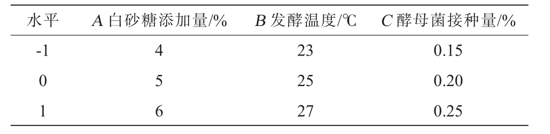 水平 A 白砂糖添加量/% B 发酵温度/℃ C 酵母菌接种量/%-1 0 1 4 5 6 23 25 27 0.15 0.20 0.25
