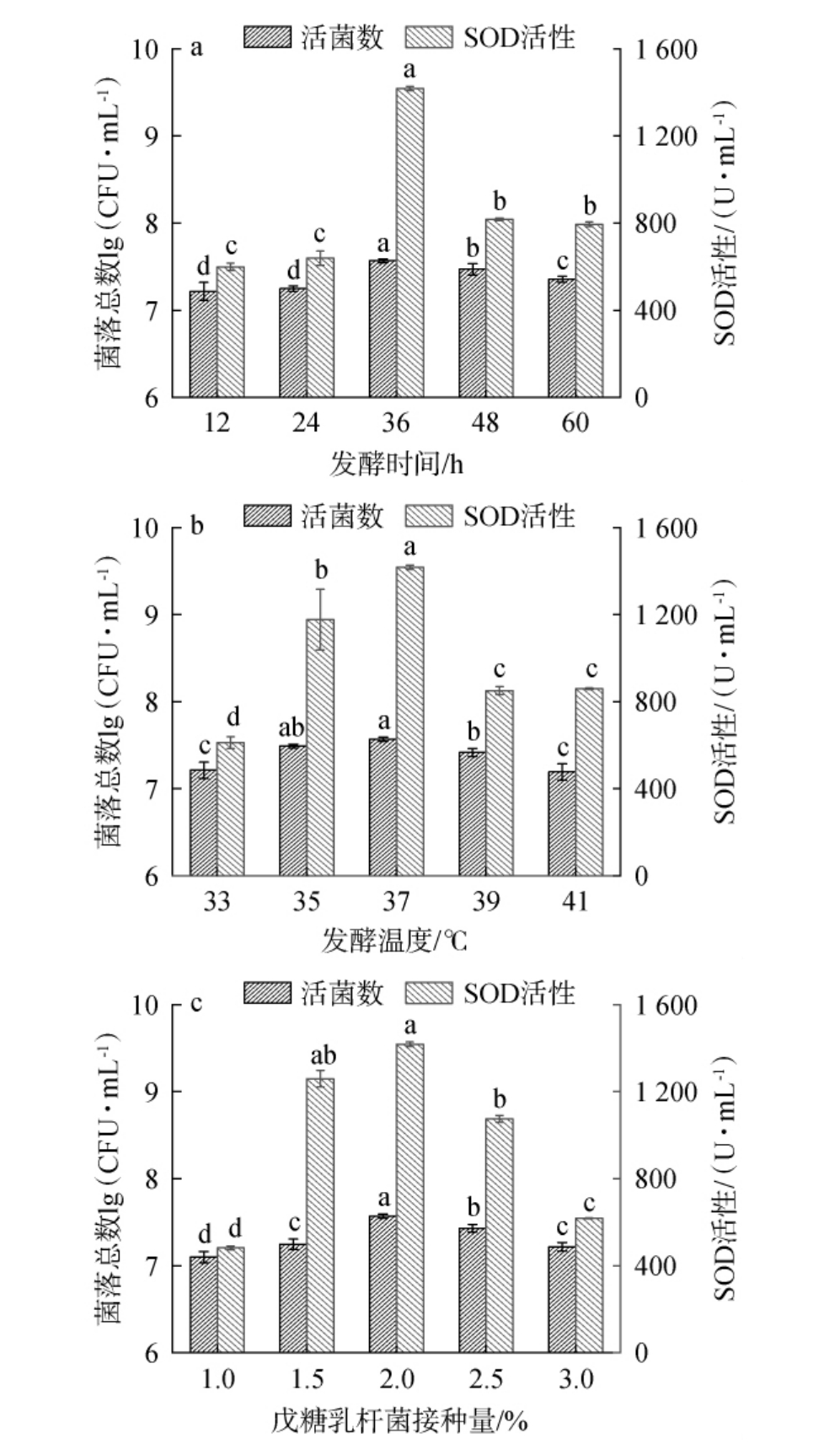 图3 发酵时间(a)、发酵温度(b)及戊糖乳杆菌接种量(c)对戊糖乳杆菌活菌数和超氧化物歧化酶活性的影响