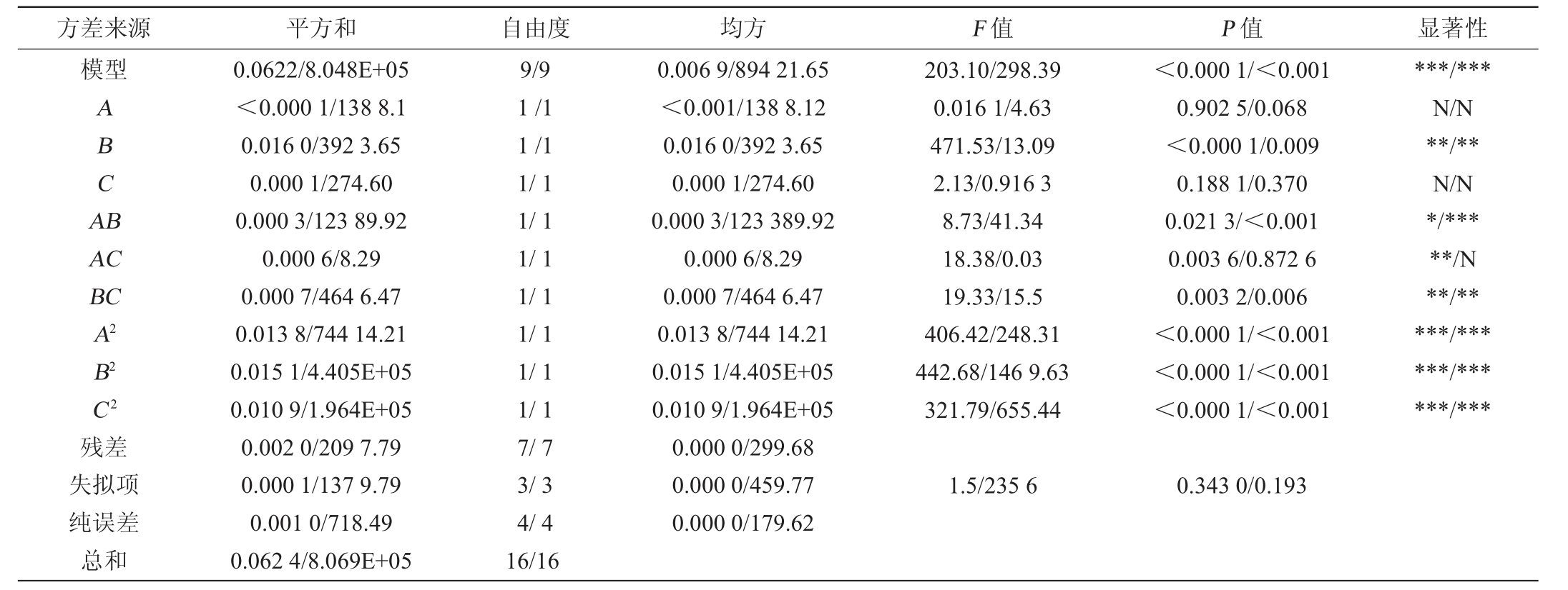 方差来源 平方和 自由度 均方 F 值 P 值 显著性模型ABCA B AC BC A2 B2 C2残差失拟项纯误差总和0.0622/8.048E+05<0.000 1/138 8.1 0.016 0/392 3.65 0.000 1/274.60 0.000 3/123 89.92 0.000 6/8.29 0.000 7/464 6.47 0.013 8/744 14.21 0.015 1/4.405E+05 0.010 9/1.964E+05 0.002 0/209 7.79 0.000 1/137 9.79 0.001 0/718.49 0.062 4/8.069E+05 9/9 1/1 1/1 1/1 1/1 1/1 1/1 1/1 1/1 1/1 7/7 3/3 4/4 16/16 0.006 9/894 21.65<0.001/138 8.12 0.016 0/392 3.65 0.000 1/274.60 0.000 3/123 389.92 0.000 6/8.29 0.000 7/464 6.47 0.013 8/744 14.21 0.015 1/4.405E+05 0.010 9/1.964E+05 0.000 0/299.68 0.000 0/459.77 0.000 0/179.62 203.10/298.39 0.016 1/4.63 471.53/13.09 2.13/0.916 3 8.73/41.34 18.38/0.03 19.33/15.5 406.42/248.31 442.68/146 9.63 321.79/655.44<0.000 1/<0.001 0.902 5/0.068<0.000 1/0.009 0.188 1/0.370 0.021 3/<0.001 0.003 6/0.872 6 0.003 2/0.006<0.000 1/<0.001<0.000 1/<0.001<0.000 1/<0.001***/***N/N**/**N/N*/*****/N**/*****/******/******/***1.5/235 6 0.343 0/0.193