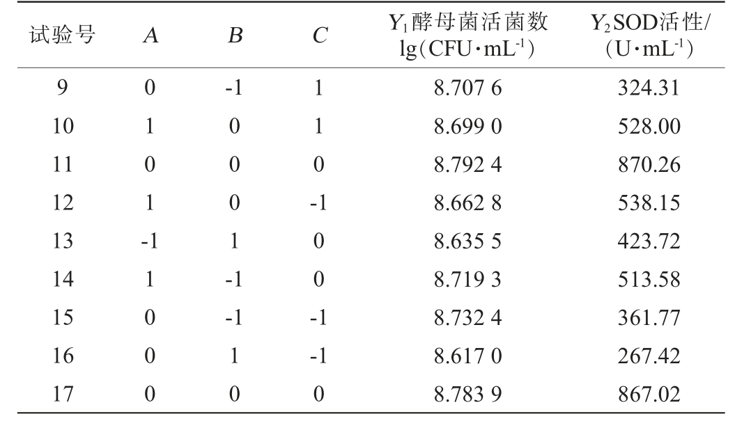 试验号 A B C Y1酵母菌活菌数lg(CFU·mL-1)Y2SOD活性/(U·mL-1)9 10 11 12 13 14 15 16 17 0101--1 110-11000 0001-1-1 100-1 10-1 0 8.707 6 8.699 0 8.792 4 8.662 8 8.635 5 8.719 3 8.732 4 8.617 0 8.783 9 324.31 528.00 870.26 538.15 423.72 513.58 361.77 267.42 867.02