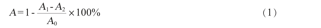 式中:A为DPPH自由基清除率,%;A0为无水乙醇+DPPH溶液的吸光度值;A1为样品溶液+DPPH溶液的吸光度值;A2为无水乙醇+样品溶液的吸光度值。
