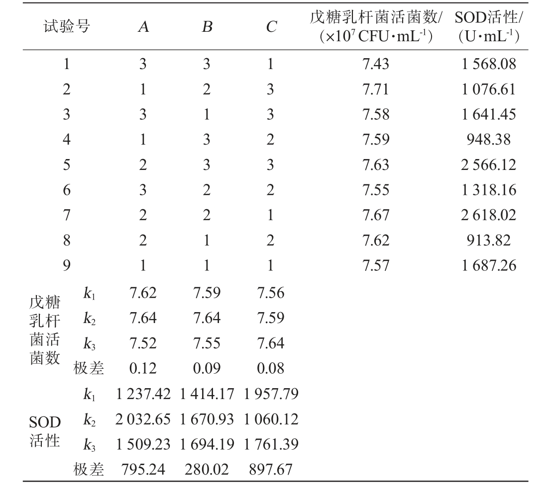试验号 A B C 戊糖乳杆菌活菌数/(×107 CFU·mL-1)SOD活性/(U·mL-1)123456789 313123221 321332211 133232121 7.43 7.71 7.58 7.59 7.63 7.55 7.67 7.62 7.57 1 568.08 1 076.61 1 641.45 948.38 2 566.12 1 318.16 2 618.02 913.82 1 687.26戊糖乳杆菌活菌数k1 k2 k3 SOD活性极差k1 k2 k3极差7.62 7.64 7.52 0.12 1 237.42 2 032.65 1 509.23 795.24 7.59 7.64 7.55 0.09 1 414.17 1 670.93 1 694.19 280.02 7.56 7.59 7.64 0.08 1 957.79 1 060.12 1 761.39 897.67
