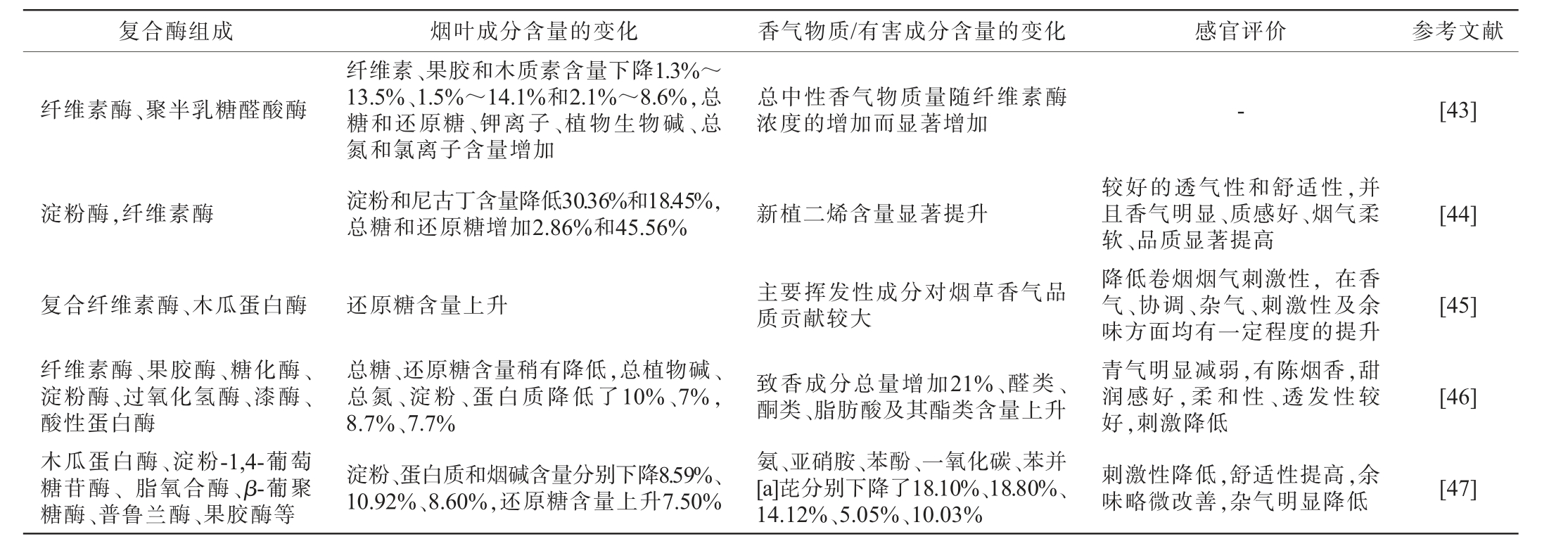 复合酶组成 烟叶成分含量的变化 香气物质/有害成分含量的变化 感官评价 参考文献纤维素酶、聚半乳糖醛酸酶 总中性香气物质量随纤维素酶浓度的增加而显著增加-[43]淀粉酶,纤维素酶纤维素、果胶和木质素含量下降1.3%~13.5%、1.5%~14.1%和2.1%~8.6%,总糖和还原糖、钾离子、植物生物碱、总氮和氯离子含量增加淀粉和尼古丁含量降低30.36%和18.45%,总糖和还原糖增加2.86%和45.56%新植二烯含量显著提升[44]复合纤维素酶、木瓜蛋白酶还原糖含量上升 主要挥发性成分对烟草香气品质贡献较大[45]纤维素酶、果胶酶、糖化酶、淀粉酶、过氧化氢酶、漆酶、酸性蛋白酶木瓜蛋白酶、淀粉-1,4-葡萄糖苷酶、 脂氧合酶、β-葡聚糖酶、普鲁兰酶、果胶酶等总糖、还原糖含量稍有降低,总植物碱、总氮、淀粉、蛋白质降低了10%、7%,8.7%、7.7%[46]淀粉、蛋白质和烟碱含量分别下降8.59%、10.92%、8.60%,还原糖含量上升7.50%致香成分总量增加21%、醛类、酮类、脂肪酸及其酯类含量上升氨、亚硝胺、苯酚、一氧化碳、苯并[a]芘分别下降了18.10%、18.80%、14.12%、5.05%、10.03%较好的透气性和舒适性,并且香气明显、质感好、烟气柔软、品质显著提高降低卷烟烟气刺激性, 在香气、协调、杂气、刺激性及余味方面均有一定程度的提升青气明显减弱,有陈烟香,甜润感好,柔和性、透发性较好,刺激降低刺激性降低,舒适性提高,余味略微改善,杂气明显降低[47]