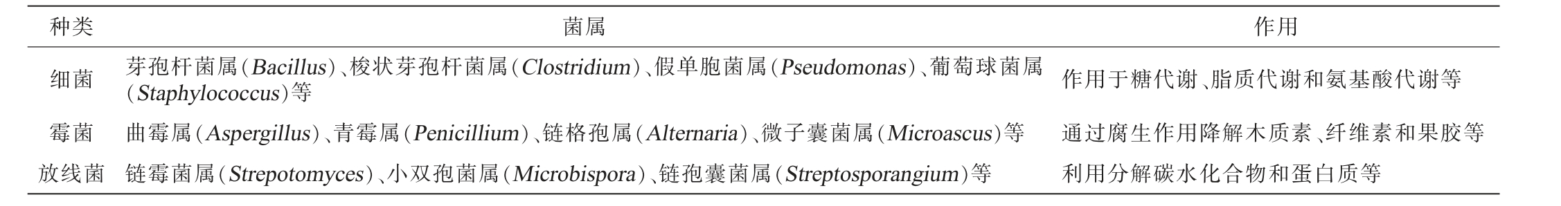 种类 菌属 作用细菌霉菌放线菌芽孢杆菌属(Bacillus)、梭状芽孢杆菌属(Clostridium)、假单胞菌属(Pseudomonas)、葡萄球菌属(Staphylococcus)等曲霉属(Aspergillus)、青霉属(Penicillium)、链格孢属(Alternaria)、微子囊菌属(Microascus)等链霉菌属(Strepotomyces)、小双孢菌属(Microbispora)、链孢囊菌属(Streptosporangium)等作用于糖代谢、脂质代谢和氨基酸代谢等通过腐生作用降解木质素、纤维素和果胶等利用分解碳水化合物和蛋白质等