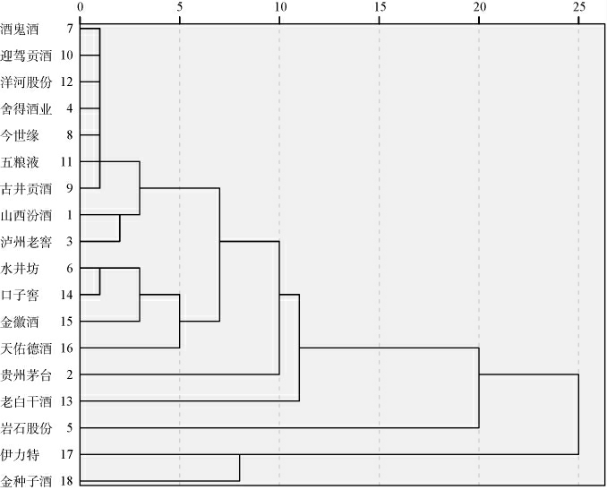 图1 基于18家白酒上市公司市场竞争力评价结果的聚类分析结果