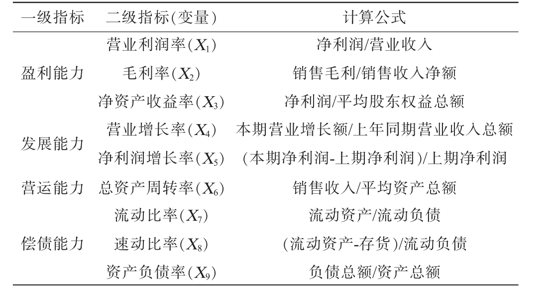 一级指标 二级指标(变量) 计算公式盈利能力发展能力营运能力偿债能力营业利润率(X1)毛利率(X2)净资产收益率(X3)营业增长率(X4)净利润增长率(X5)总资产周转率(X6)流动比率(X7)速动比率(X8)资产负债率(X9)净利润/营业收入销售毛利/销售收入净额净利润/平均股东权益总额本期营业增长额/上年同期营业收入总额(本期净利润-上期净利润)/上期净利润销售收入/平均资产总额流动资产/流动负债(流动资产-存货)/流动负债负债总额/资产总额