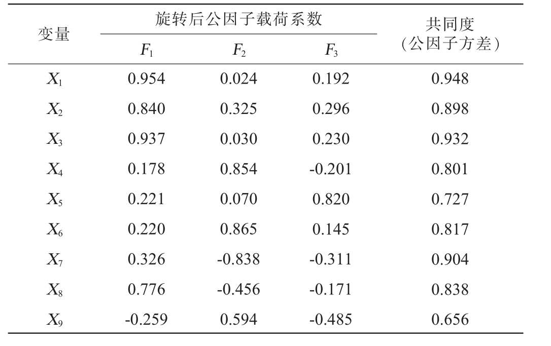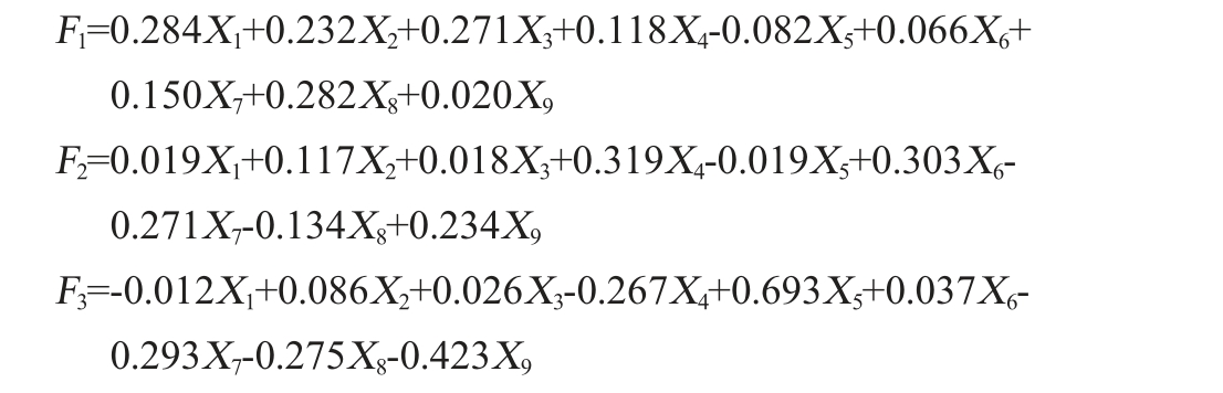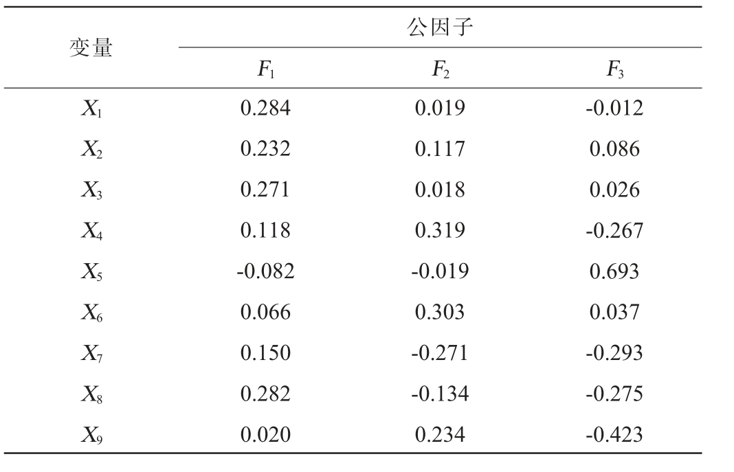 变量公因子F1 F2 F3 X1X2X3X4X5X6X7X8X9 0.284 0.232 0.271 0.118-0.082 0.066 0.150 0.282 0.020 0.019 0.117 0.018 0.319-0.019 0.303-0.271-0.134 0.234-0.012 0.086 0.026-0.267 0.693 0.037-0.293-0.275-0.423
