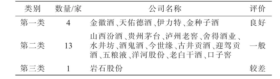 类别 数量/家 公司名称 评价第一类4良好第二类13一般第三类1金徽酒、天佑德酒、伊力特、金种子酒山西汾酒、贵州茅台、泸州老窖、舍得酒业、水井坊、酒鬼酒、今世缘、古井贡酒、迎驾贡酒、五粮液、洋河股份、老白干酒、口子窖岩石股份较差