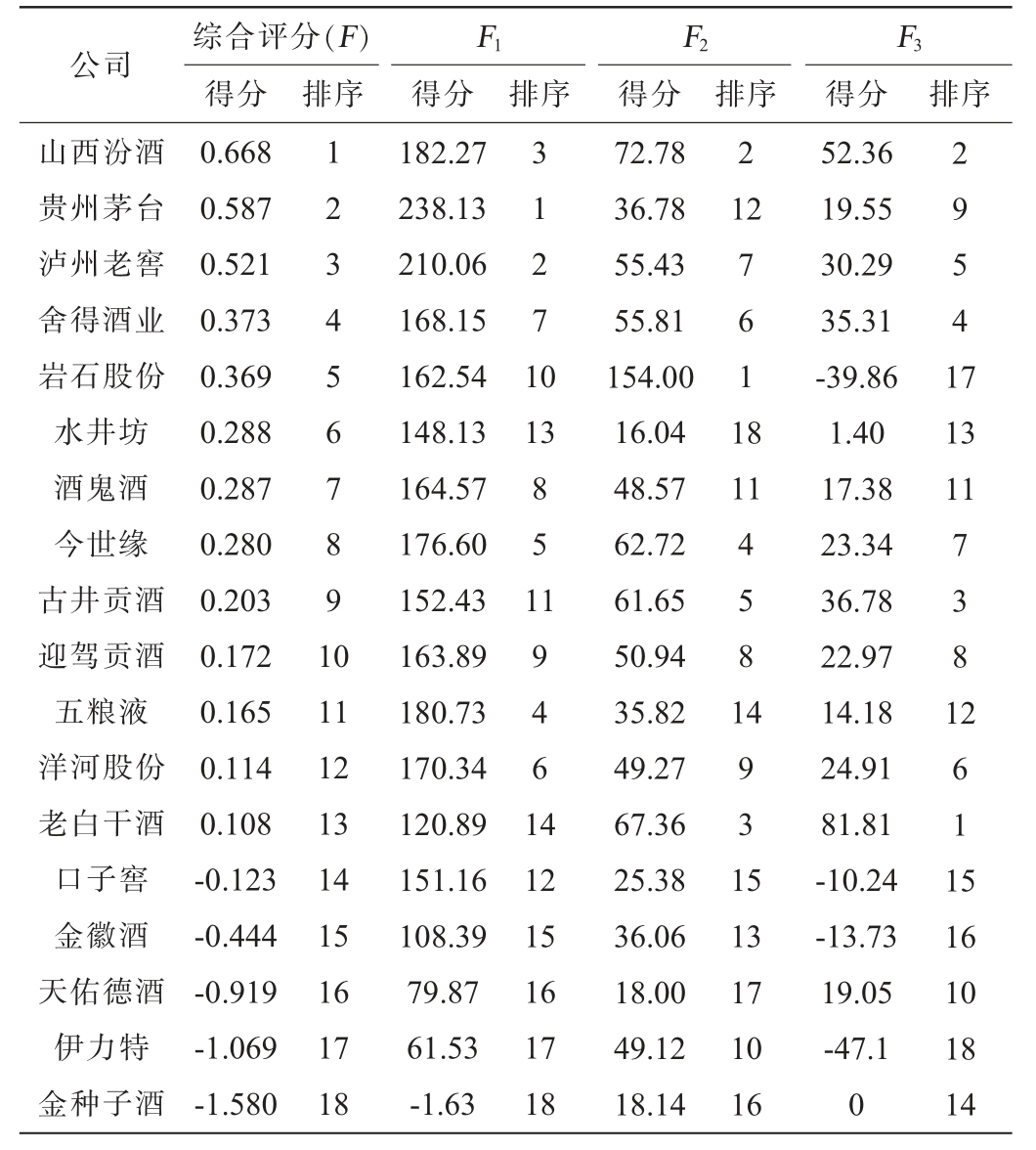 通过最大方差正交旋转法对因子载荷矩阵进行旋转,可以得到具有更加明确含义的公因子,载荷值越高代表其解释力越好。旋转后的因子载荷矩阵见表4。由表4可知,第一公因子(F1)在营业利润率、毛利率、净资产收益率载荷系数较高,分别为0.954、0.840、0.937,代表白酒企业的盈利能力;第二公因子(F2)在营业增长率、总资产周转率载荷系数较高,分别为0.854、0.865,代表白酒企业的运营能力;第三共因子(F3)在净利润增长率载荷系数较高,为0.820,其代表白酒企业的发展能力。