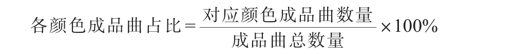 拆曲时由经验丰富的技术人员通过观察确定曲坯类型,表面为金黄色或黄褐色,断面为金黄色或灰色是黄曲;表面和断面均为焦黑色的是黑曲;表面和断面为麦色或者白色是白曲。不同颜色成品曲占比计算方法如下: