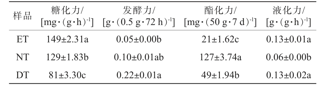 样品 糖化力/[mg·(g·h)-1]发酵力/[g·(0.5 g·72 h)-1]酯化力/[mg·(50 g·7 d)-1]液化力/[g·(g·h)-1]ET NT DT 149±2.31a 129±1.83b 81±3.30c 0.05±0.00b 0.10±0.01ab 0.22±0.01a 21±1.62c 127±3.74a 49±1.94b 0.13±0.01a 0.06±0.00b 0.13±0.02a