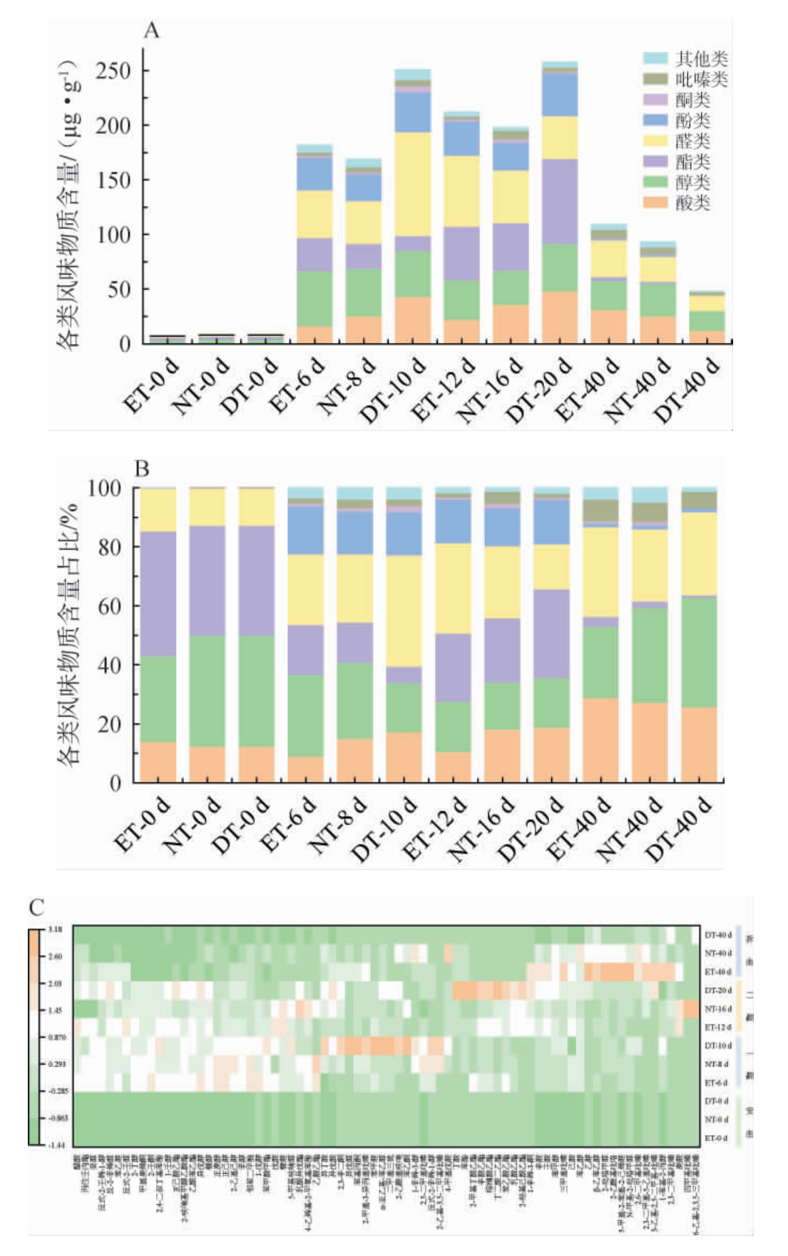Fig.3 Contents (A) and proportion (B) of various types of flavor substances, and heat map of volatile flavor substance contents (C) during high-temperature Daqu fermentation process